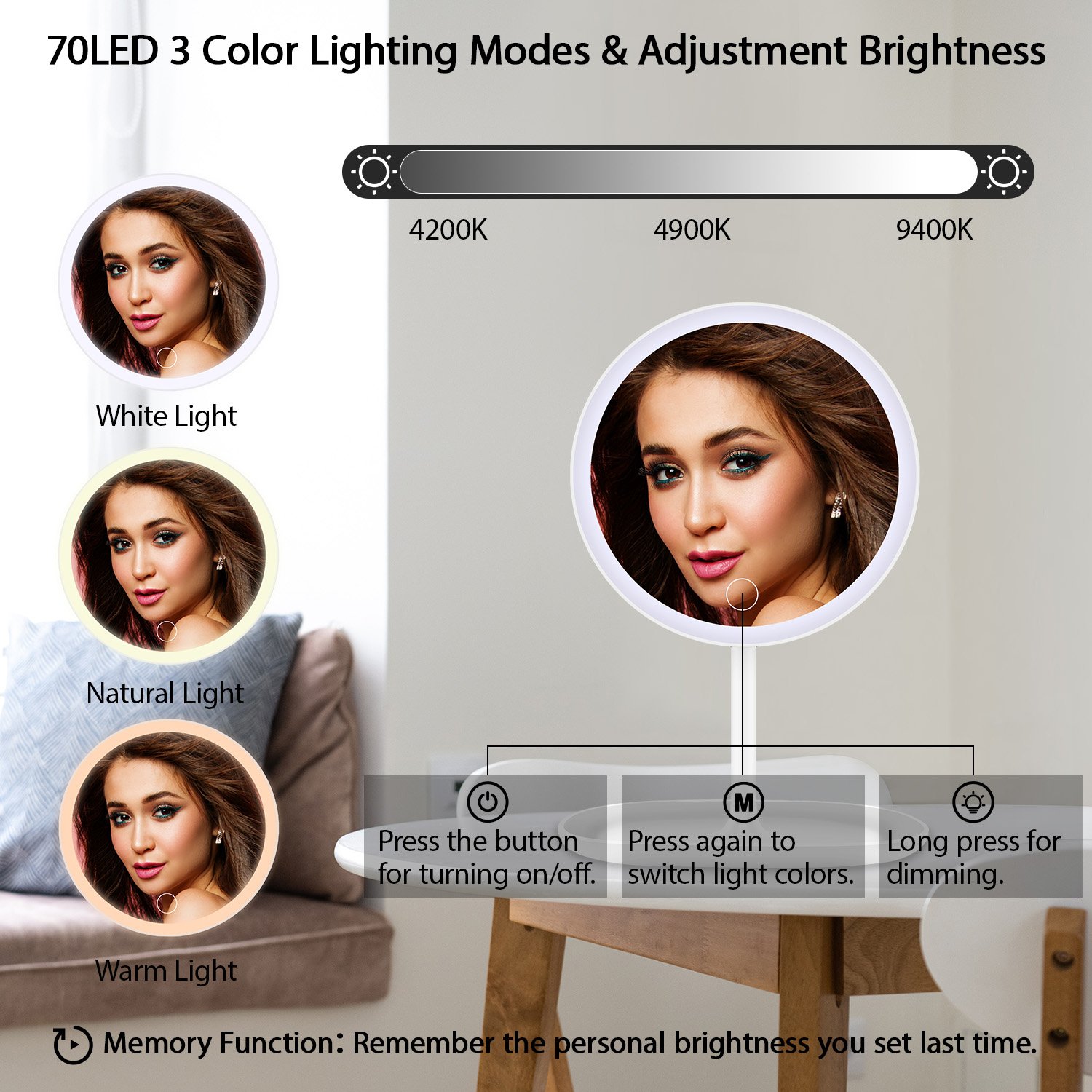 【3 COLOR LIGHTING MODES】- Our makeup mirror specifically designed 70 built – in bright LED beads , with 3 kinds of lights , white light , natural light , warm light , which is intelligent to OFF/ON by touch sensor switch .