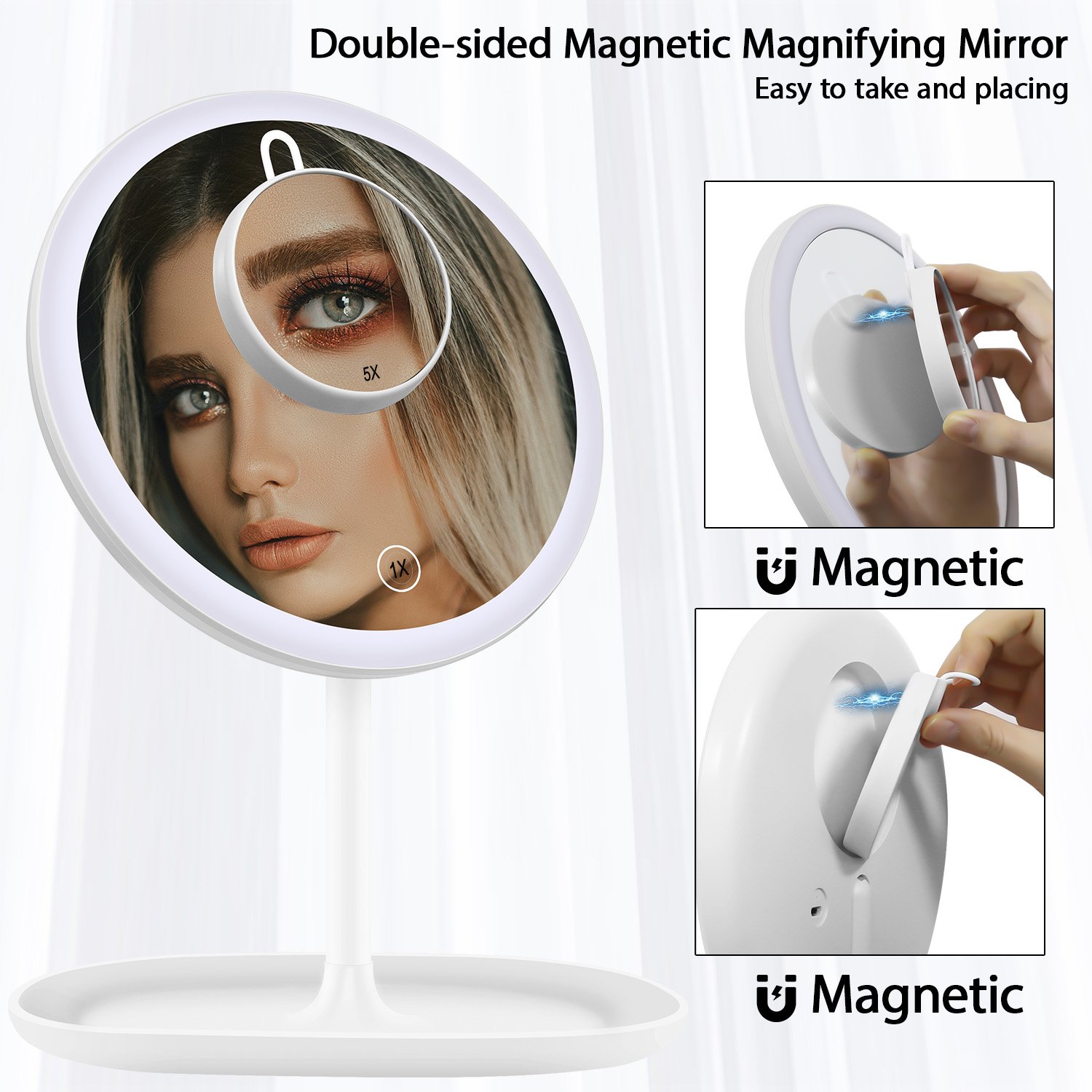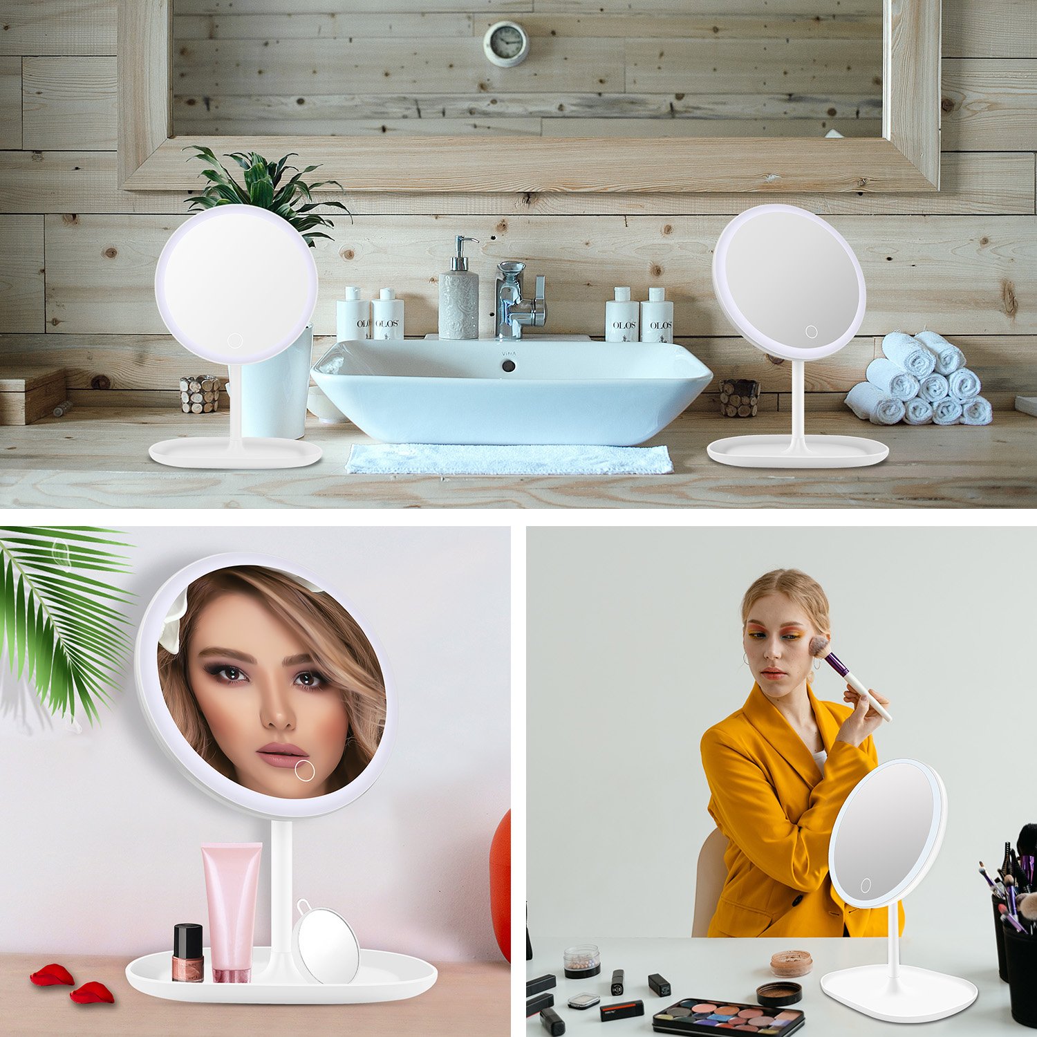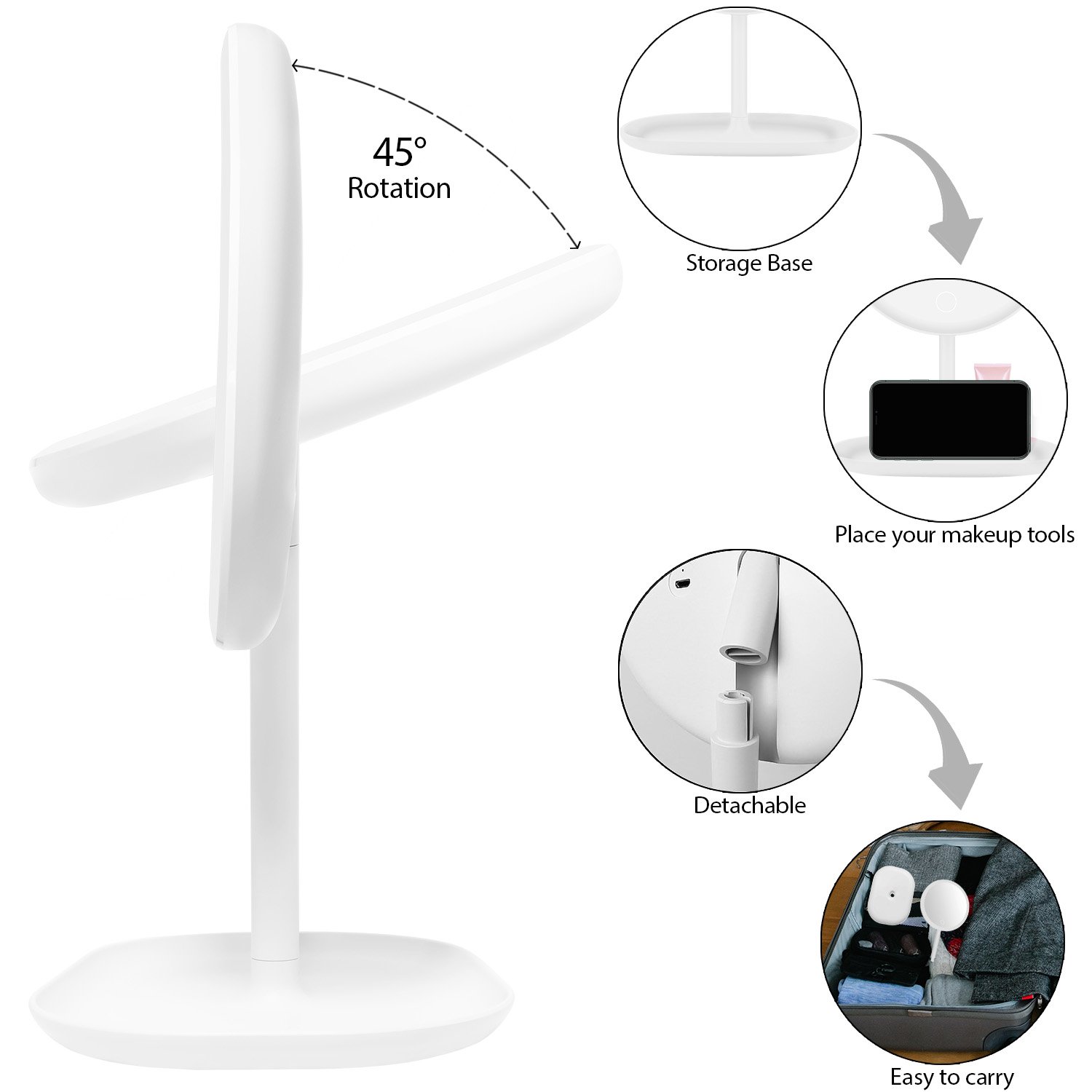 【RECHARGEABLE & STORAGE BASE】- Built-in 1000mAh Rechargeable battery provides up to 6 hours of working time for LED cosmetic mirrors at medium brightness with bright white lights. The bottom of the makeup mirror has a square storage disk, which can store some daily wear jewelry or lipstick, and so on.