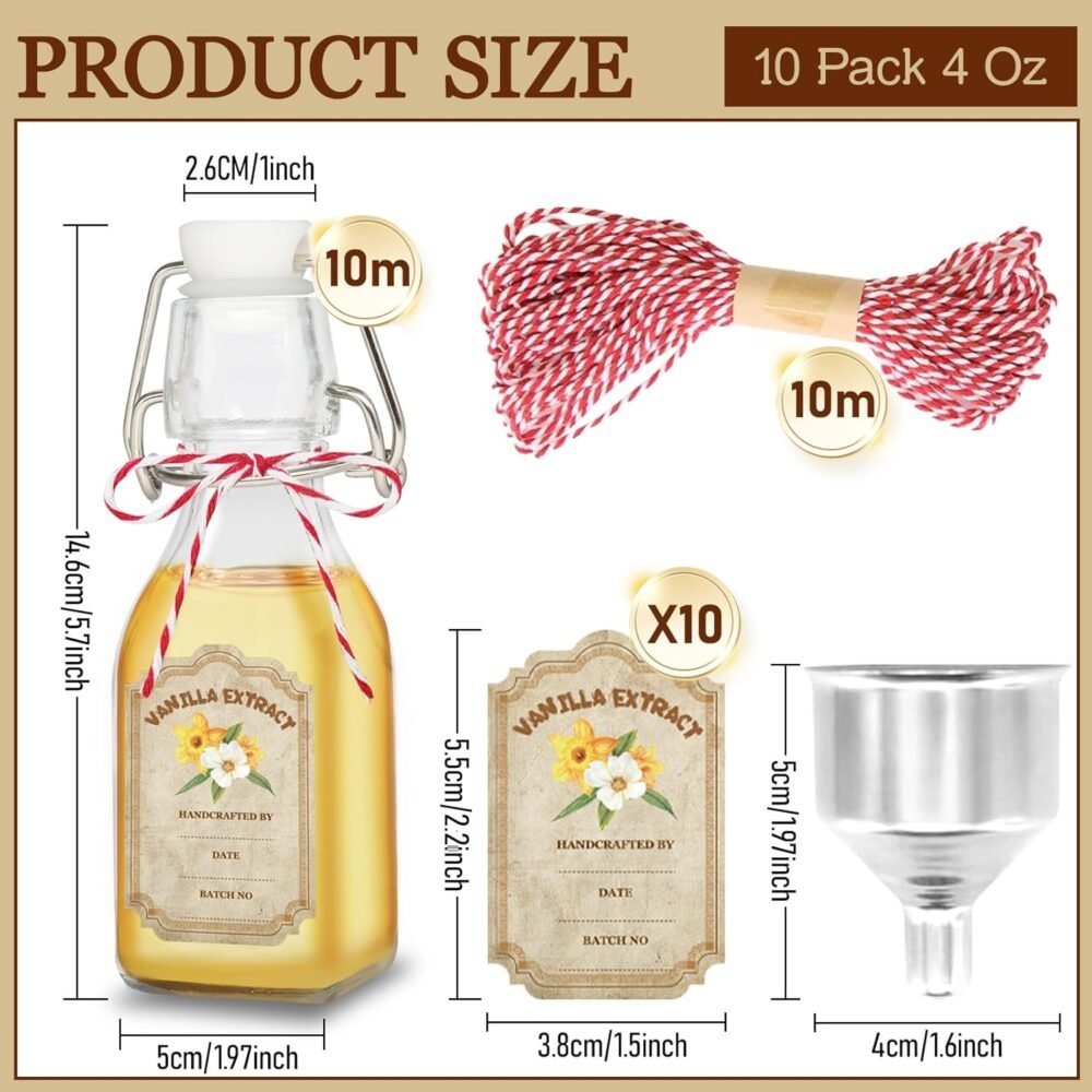 10 Pack Swing Top Glass Vanilla Extract Bottles 4 oz with Lids, Vanilla Extract Labels and Funnel, Flip Top Glass Boston Vanilla Bottles Jars for Syrup Gift