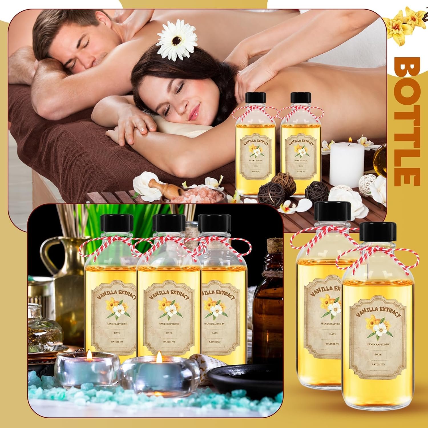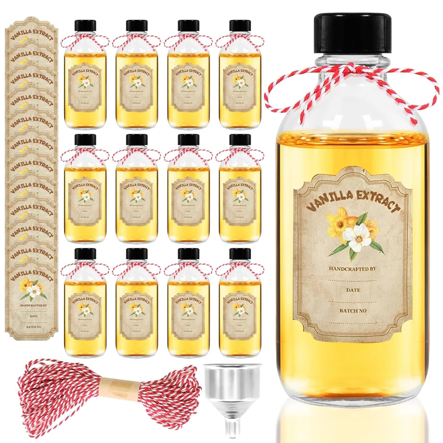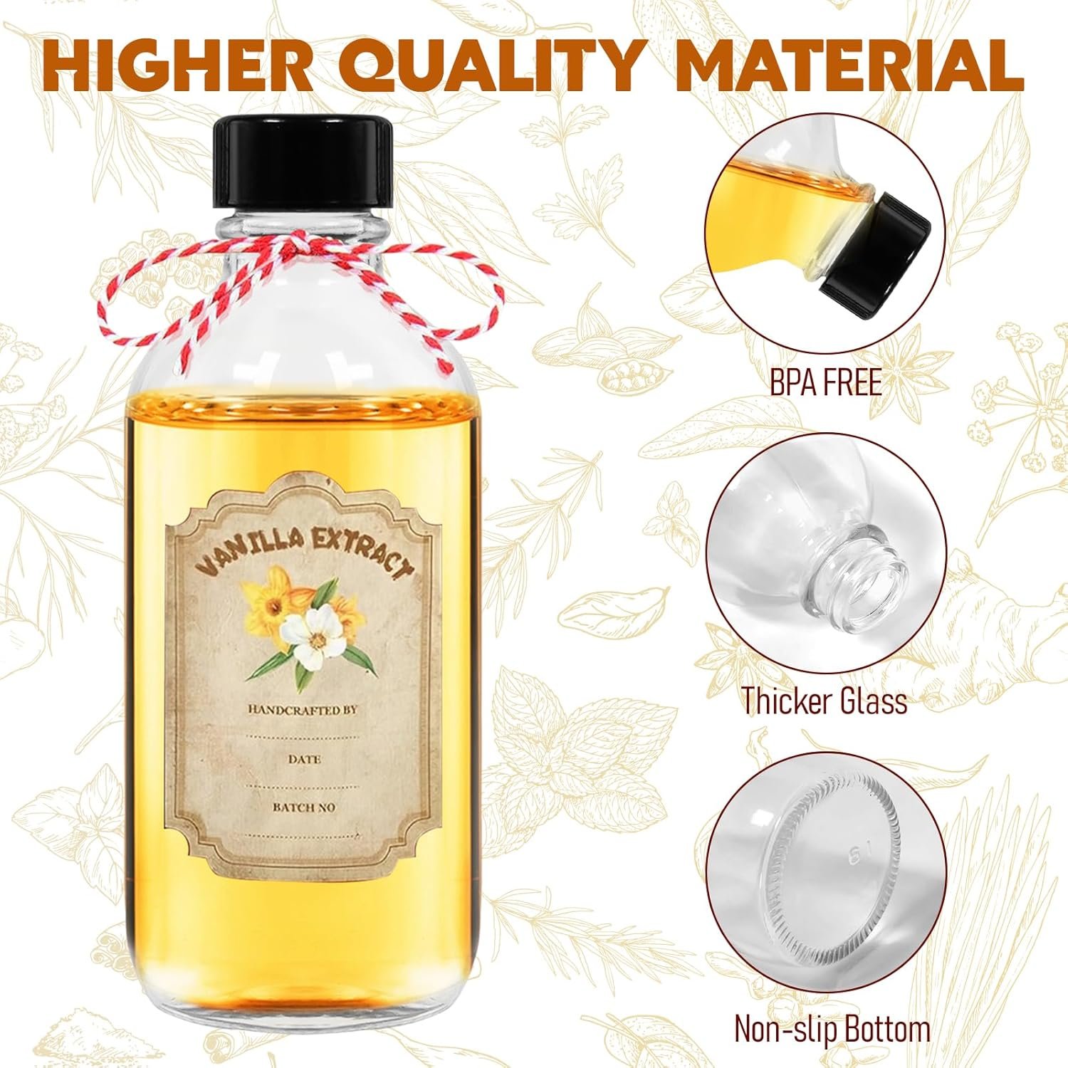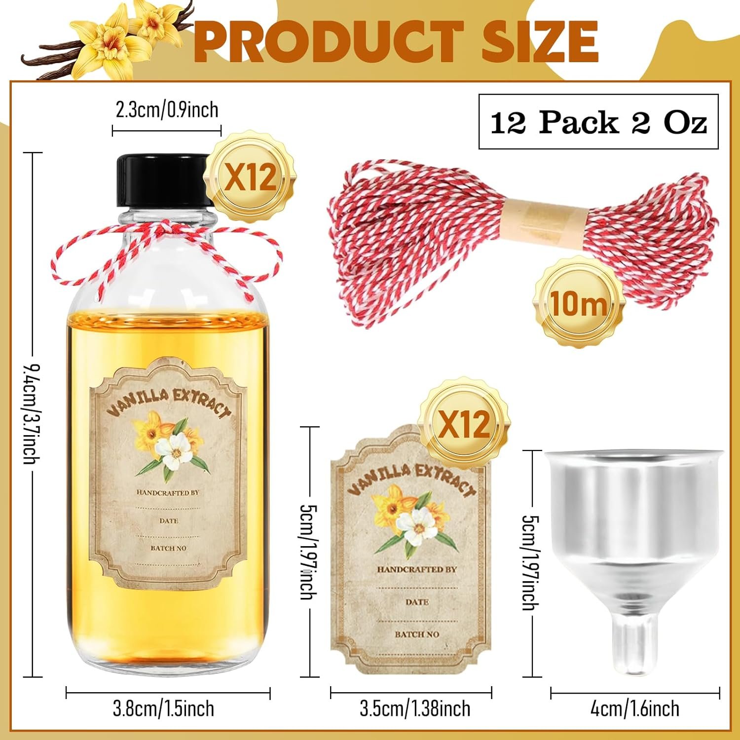 12 Pack Glass Vanilla Extract Bottles 2 oz with Lids, 12 PCS Vanilla Extract Labels and Funnel, Glass Boston Vanilla Bottles for Syrup Gift, Jars for Vanilla Extract, Glass Bottles for Vanilla Extract