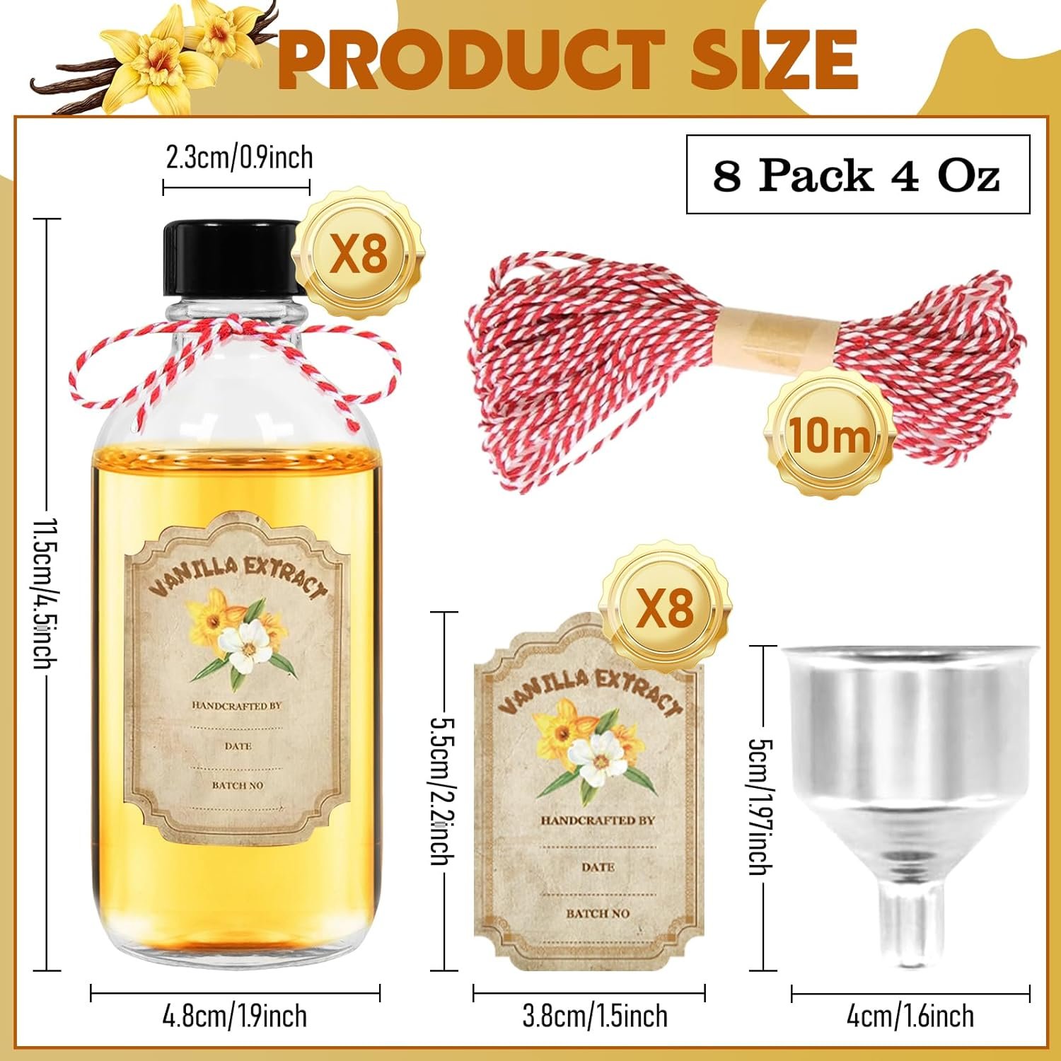 8 Pack Glass Vanilla Extract Bottles 4 oz with Lids, 8 PCS Vanilla Extract Labels and Funnel, Glass Boston Vanilla Bottles for Syrup Gift, Jars for Vanilla Extract, Glass Bottles for Vanilla Extract